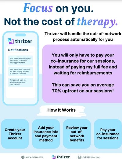 Get your reimbursements FASTER. We handle the hassle of submitting claims. The service is call Thrizer, helps facilitate clients reimbursements from their Insurance provider for out of network (OON) therapy. We can provide an “instant check” if your insurance provider pays for OON and if you have a deductible.